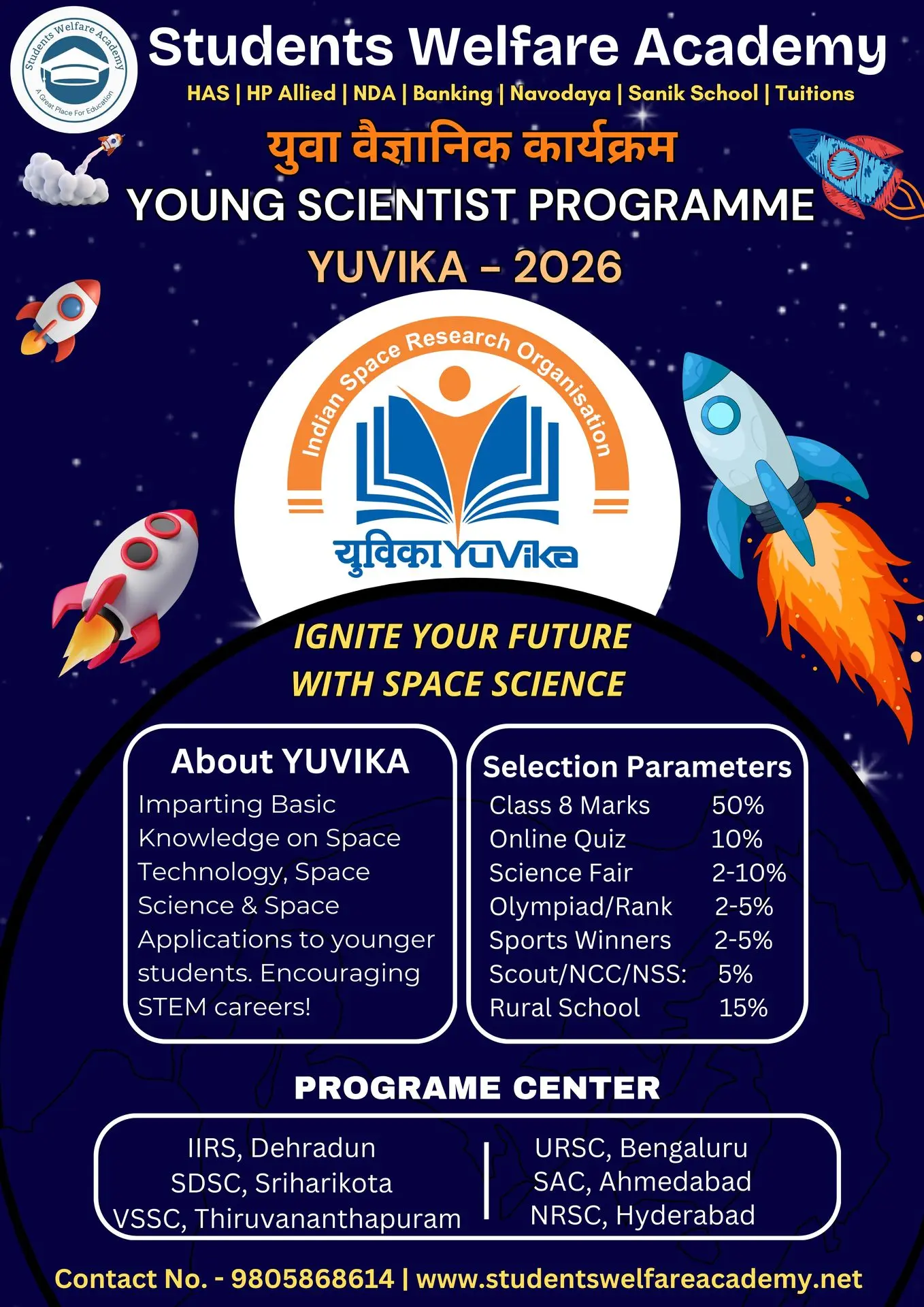 Do you dream of rockets, satellites, and exploring the vastness of space? The Indian Space Research Organisation (ISRO) is back with its prestigious Young Scientist Programme β YUVIKA 2026, and Students Welfare Academy is here to guide you on this stellar journey!